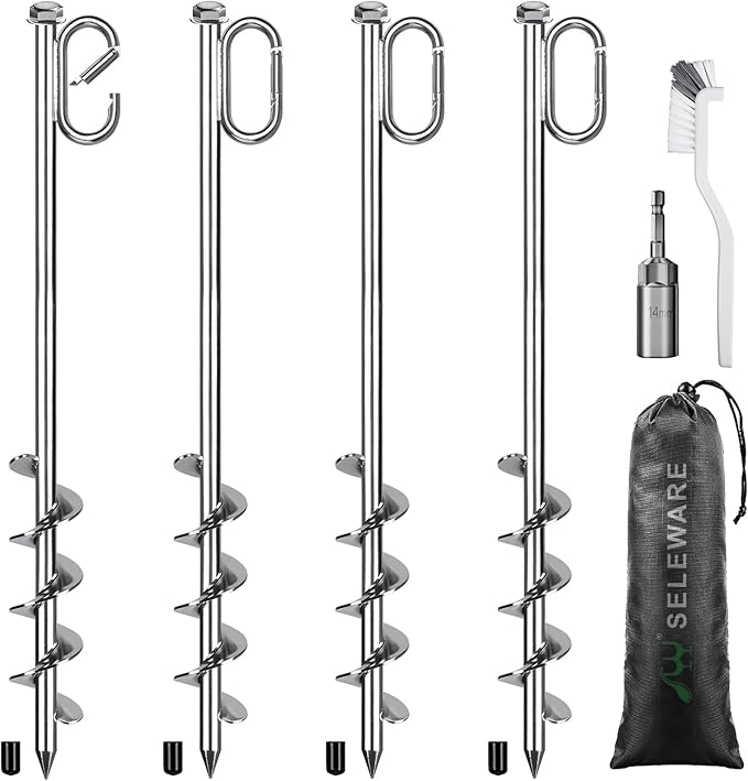• 【Complete Set】Includes four 14” long ground anchors, a drill nut attachment, a storage bag, and a cleaning brush for a complete anchoring solution.