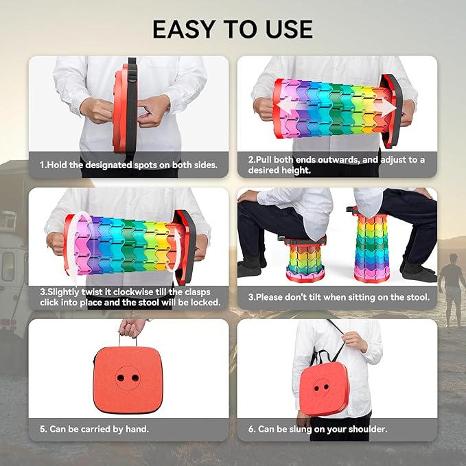• Collapsible Camping Stool - Our retractable stool can be adjusted to the desired height ranging from 2.5 inches to 18 inches. Different heights can be set according to your usage scenario. You will find that this fold-up stool is suitable for people of all ages.