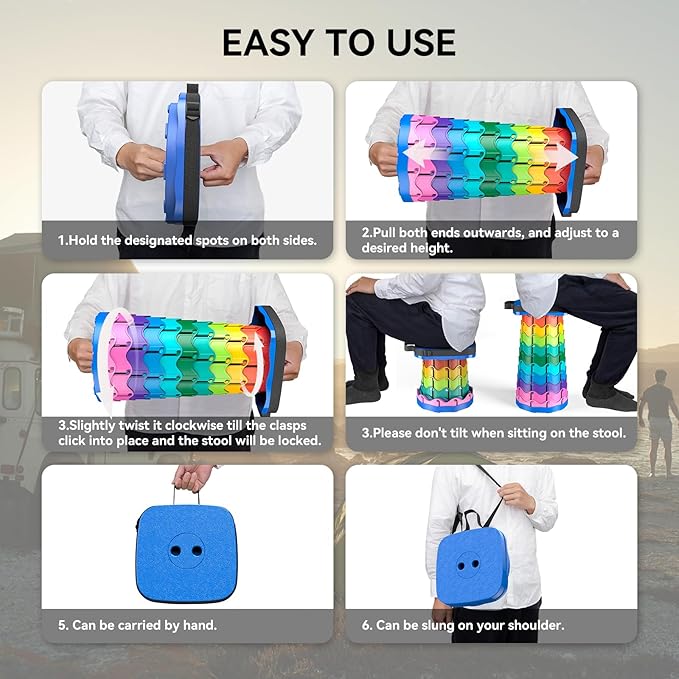 • Collapsible Camping Stool - Our retractable stool can be adjusted to the desired height ranging from 2.5 inches to 18 inches. Different heights can be set according to your usage scenario. You will find that this fold-up stool is suitable for people of all ages.