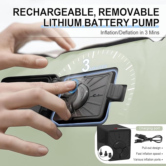 • 3-Minute Fast Inflation with Dual-Power Option:Features a built-in 1300mAh lithium battery pump (USB-C rechargeable) for cordless inflation in just 3 minutes, plus an included power cord for outlet use. The LED display clearly shows the power mode.A single charge supports multiple full inflations and deflations, making it perfect for outdoor adventures or quick indoor setup.