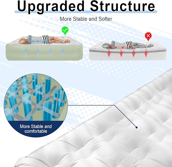 • Thickened & Puncture-Resistant Material for Long-Term Durability:Constructed with wear-resistant Oxford fabric exterior and extra-thickened PVC interior for superior leak-proof and puncture resistance. Includes a repair patch kit for added assurance.(Note: Minor initial air loss is normal; simply reinflate once after setup to maintain firmness all night.