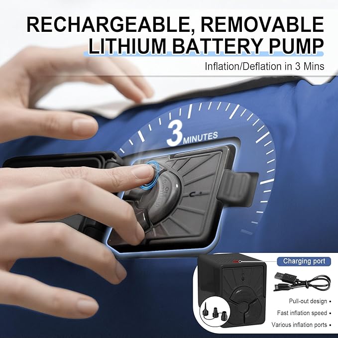 • 3-Minute Fast Inflation with Dual-Power Option:Features a built-in 1300mAh lithium battery pump (USB-C rechargeable) for cordless inflation in just 3 minutes, plus an included power cord for outlet use. The LED display clearly shows the power mode.A single charge supports multiple full inflations and deflations, making it perfect for outdoor adventures or quick indoor setup.