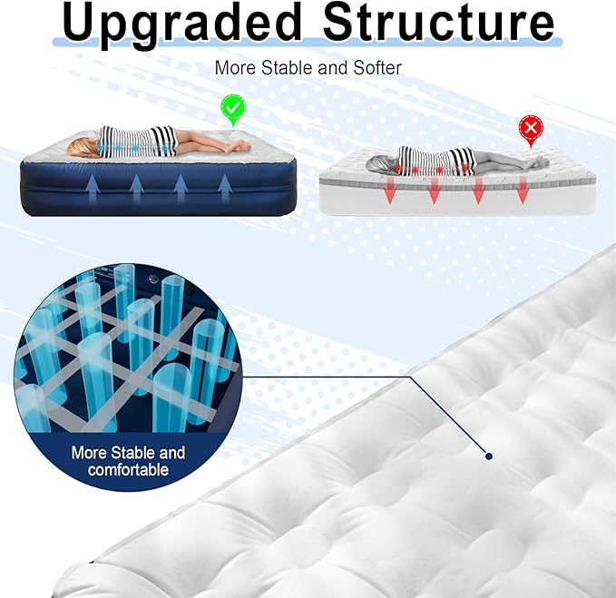 • Thickened & Puncture-Resistant Material for Long-Term Durability:Constructed with wear-resistant Oxford fabric exterior and extra-thickened PVC interior for superior leak-proof and puncture resistance. Includes a repair patch kit for added assurance.(Note: Minor initial air loss is normal; simply reinflate once after setup to maintain firmness all night.