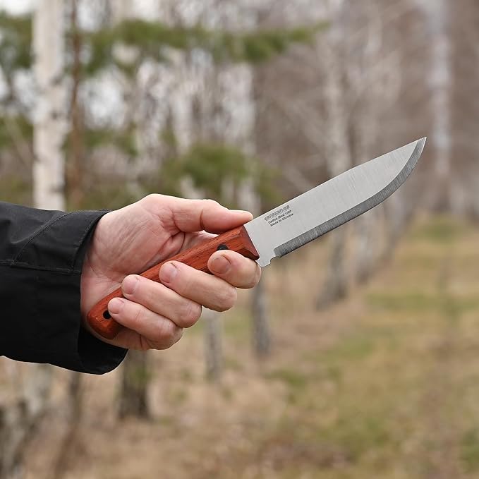 • 💪 STRONG AND STURDY: Experience the strength of this survival knife, hardened to 56-57 HRC for excellent edge retention. The well-balanced design and the padauk wood handle ensure a reliable and hard-wearing camping companion