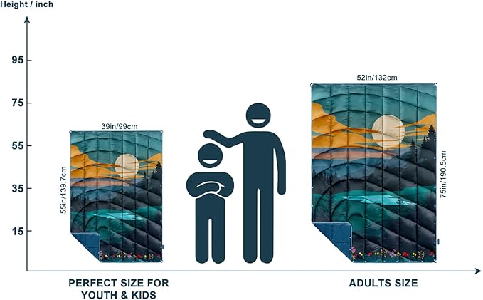 • LIGHTWEIGHT AND PACKABLE: The camping blanket measures 39*55 inches and measures 6*12 inches when packed. Weighing only 1.8 pounds, the products you buy include a camping blanket and a portable storage bag. This will be the ideal blanket for your outdoor, hiking and camping adventures.
