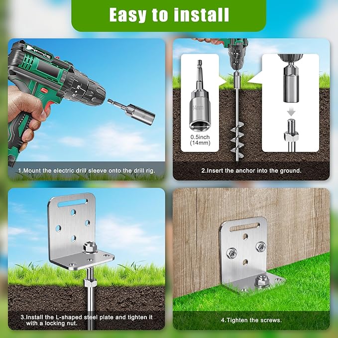 • Easy to install: The canopy anchors set includes 4pcs 24" ground stakes anchor, 1pcs 0.5inch electric drill sleeve, 4pcs L-shaped brackets and 8pcs screws. Mount the electric drill sleeve onto the drill rig and can start using. Used with a drill rig, it can be installed faster and more labor-saving.