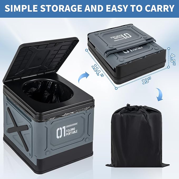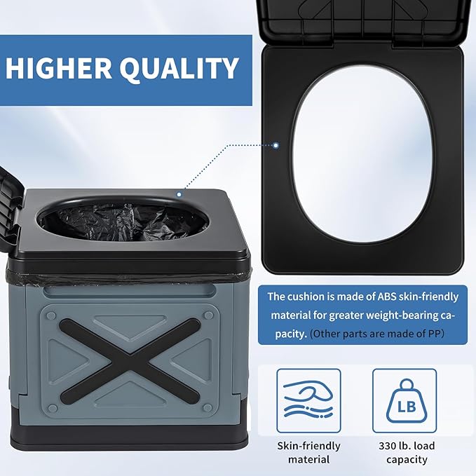 • [Folding Camping Toilet] Made of ABS plastic , supports 330 lbs (150 kg) ,Multi-Use Function,it Includes 12 liquid waste gel packs and 12 trash bags,portable and stable