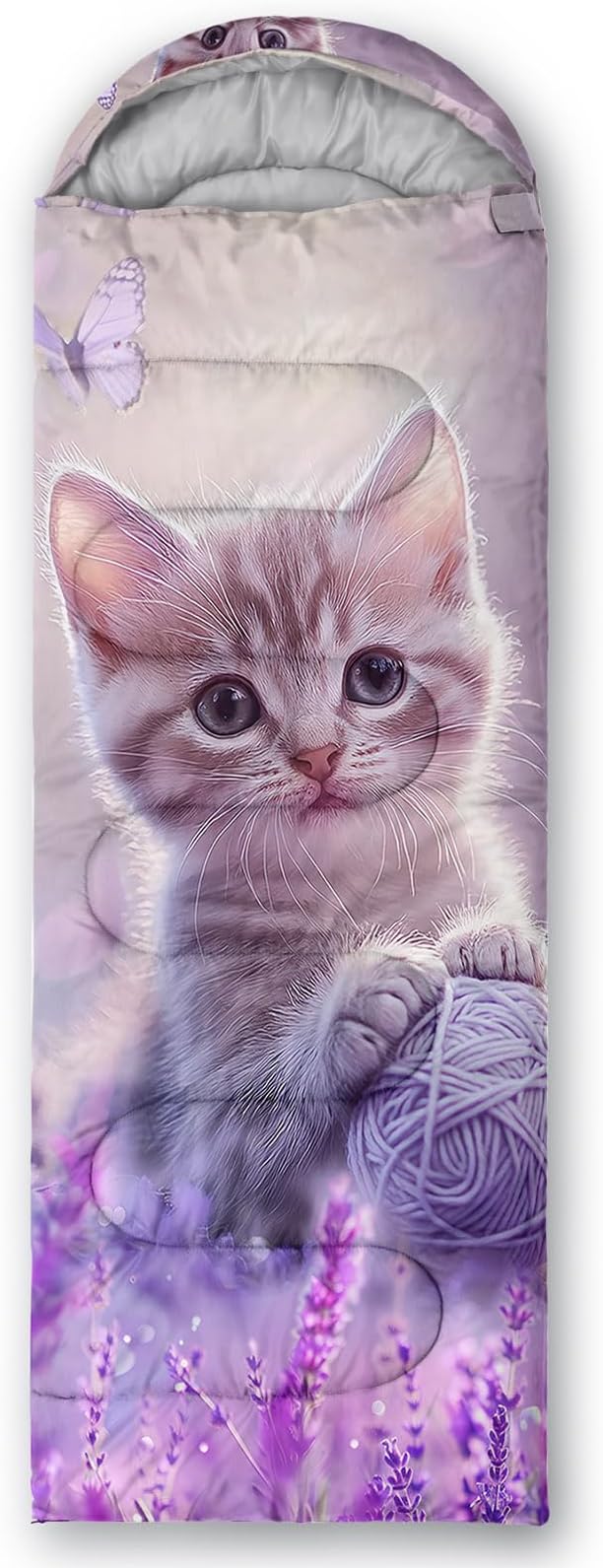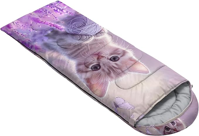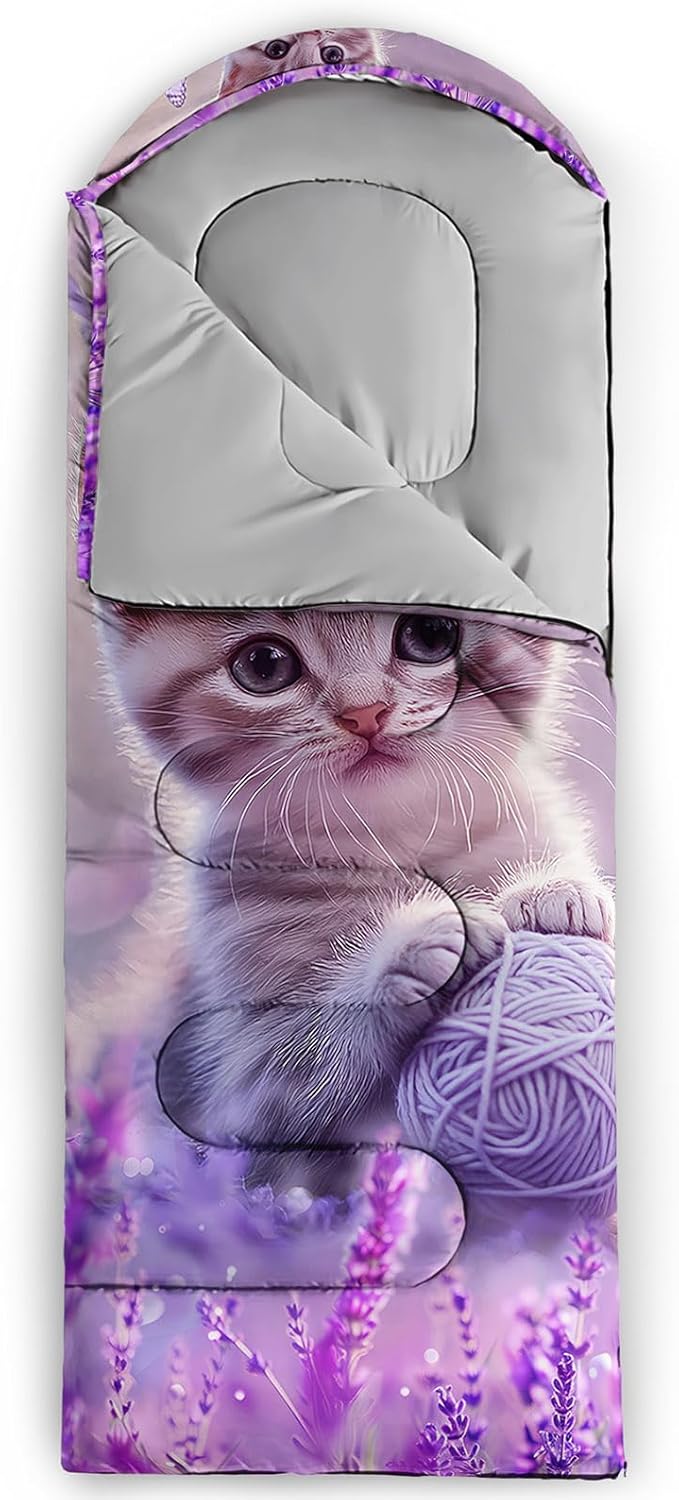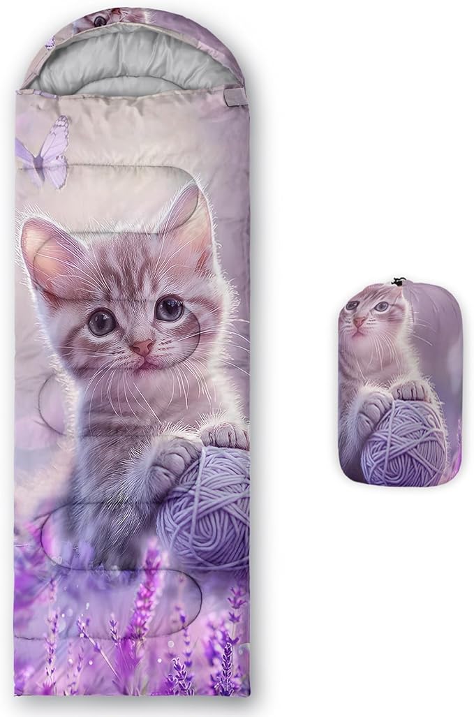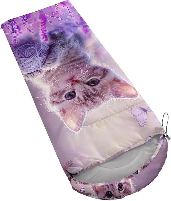 • 【Fashion Design】This waterproof and lightweight sleeping bag is designed with a cute cat pattern.Cat is rolling a ball of string in lavender bush surrounded by butterflies,which adds a comfortable atmosphere.As camping essentials,you can give it as a gift to your family and friends.