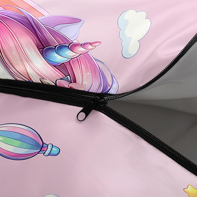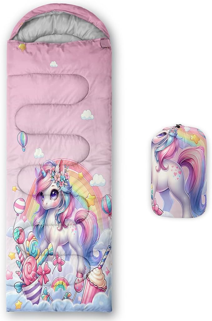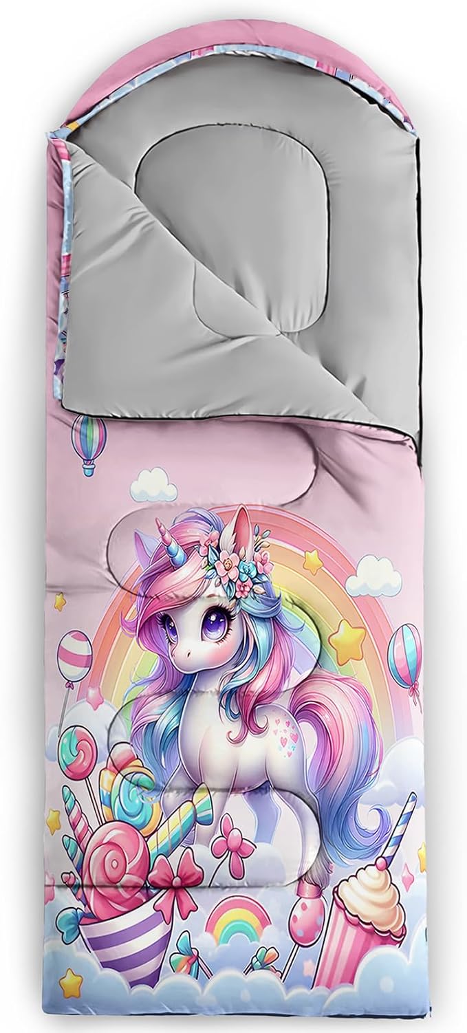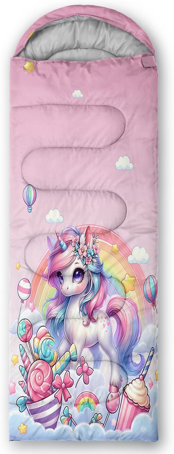 • 【Fashion Design】This waterproof and lightweight sleeping bag is designed with a cartoon unicorn pattern.Various patterns on this girl sleeping bag including candy,dessert,balloon and rainbow,adding a comfortable atmosphere.