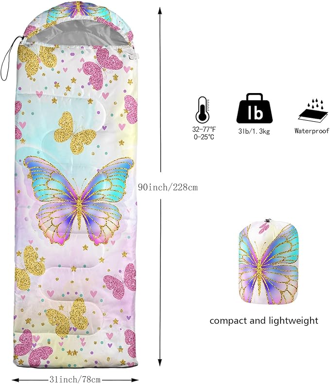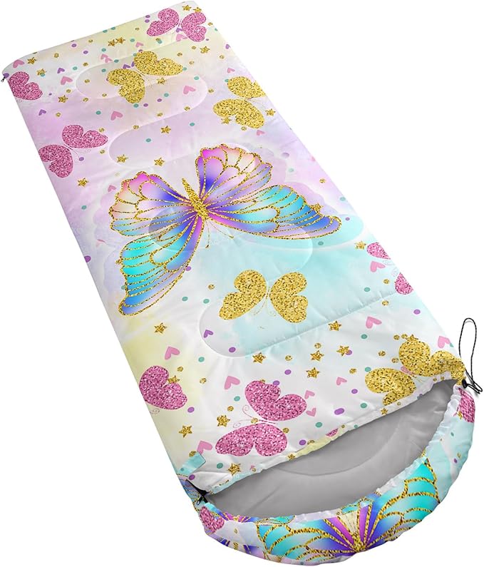 • 【Fashion Design】This is an animal-themed sleeping bag printed with colorful butterfly parttern.This camping sleeping bag uses comfortable fabric to make you feel warm and comfortable.As camping essentials,you can give this hiking sleeping bag as a gift to your family or friends.