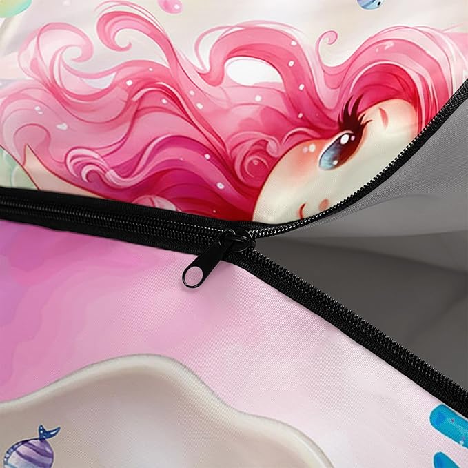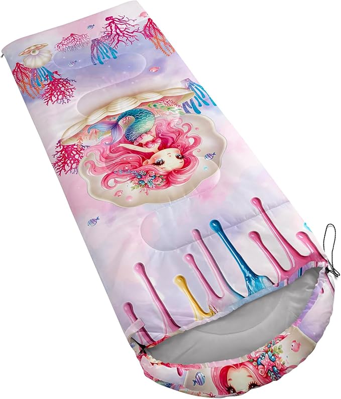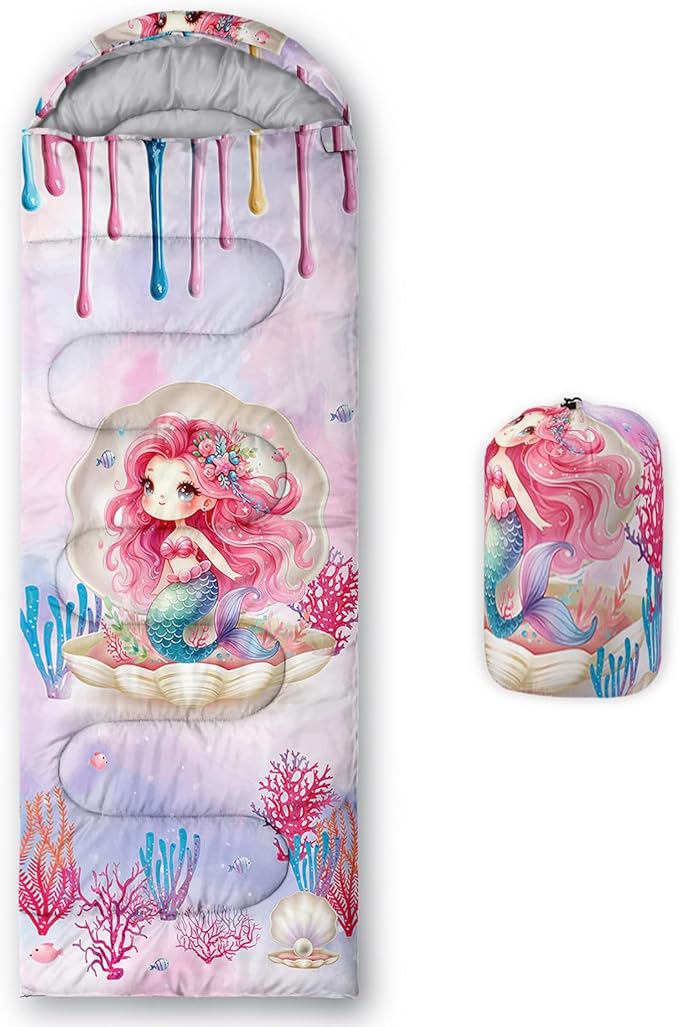 • 【Fashion Design】This sleeping bags for kids is designed with mermaid pattern.Various patterns on this camping sleeping bag including coral,fish and shell.Mermaid is sitting in shell,which adds a comfortable atmosphere.As camping essentials,you can give it as a gift to your family and friends.