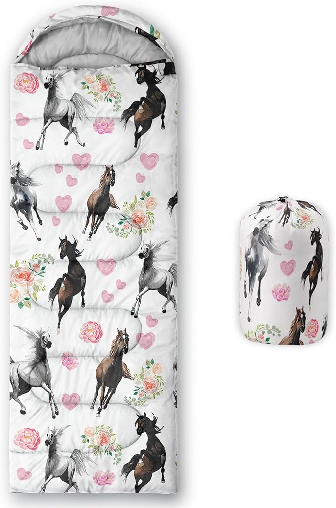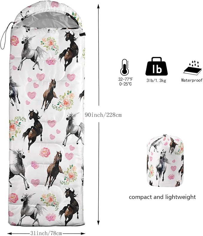 • SUITABLE:The sleeping bag can be used for 3 Seasons.SIZE:90.5"L x 31.5"W Suggenal extreme temperature: 41 ℉ -77 ℉.Applicable in a variety of scenarios,such as Travel camping pajamas party,It's very suitable for you to travel with your children.Half-circle hood with adjustable drawstring,which can keep you warm and prevent your humidity