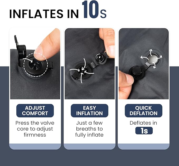 • Versatile Use – Perfect for hiking, camping, backpacking, fishing, beach outings, RV trips, or any outdoor adventure. Whether you're lying in a tent or traveling by plane, the inflatable and cushioned design ensures a comfortable rest wherever you are.