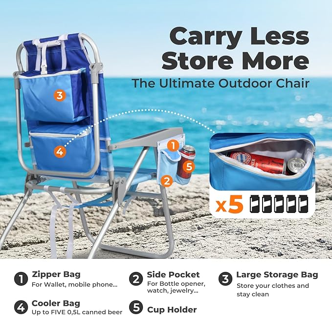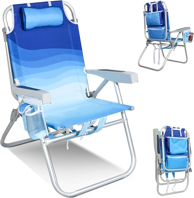Tall Beach Chairs for Adults – 5-Position Reclining Backpack Chair with Large Insulated Cooler & Storage Pocket, Aluminum Frame, Portable for Travel & Outdoor, Supports 300lbs, Wave Blue
