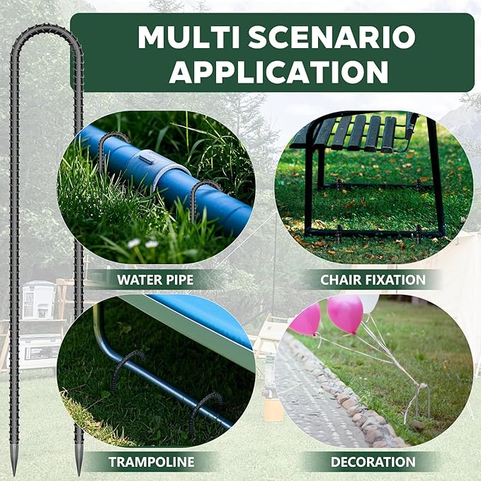 • Wide Applications:Versatile and reliable, our lawn stakes are perfect for a variety of outdoor projects. Whether you're securing tents, tarps, or landscape fabric, trust in their reliability and versatility for all your anchoring needs