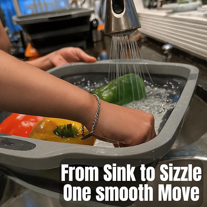 • Shape-Shifting Magic – Collapsible Design – Use fully expanded for large meal prep, half-collapsed for small batches, or fully flat for slicing or serving. Folds down to 1.5" for easy storage—perfect for camping, BBQs, RVs, tailgating, and small kitchens.