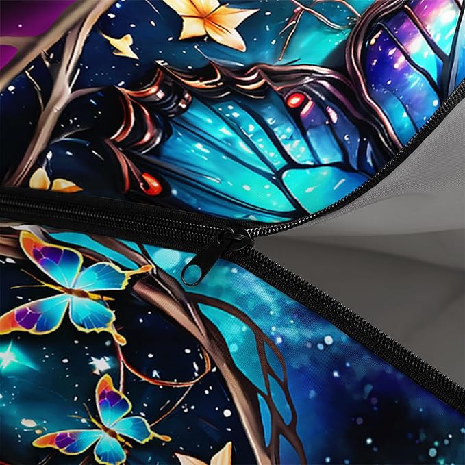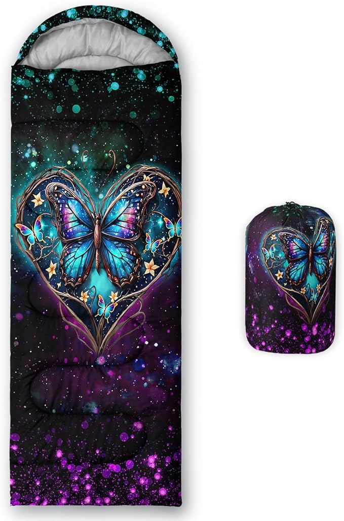 • 【Design】This children's sleeping bag is printed with a beautiful heart and butterfly pattern,with colorful glitter,adding a different color to your outdoor travel.And the sleeping bag is made of waterproof fabric,so it can stay dry even on wet nights.