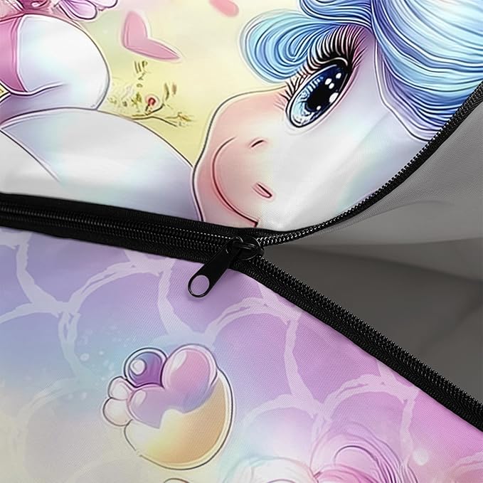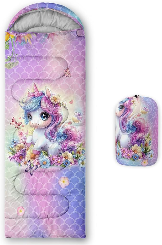 • 【Design】This colorful sleeping bag has a mermaid scales background and a beautiful unicorn pattern printed in the middle.It is full of childishness and vitality,bringing a unique atmosphere to your outdoor activities.