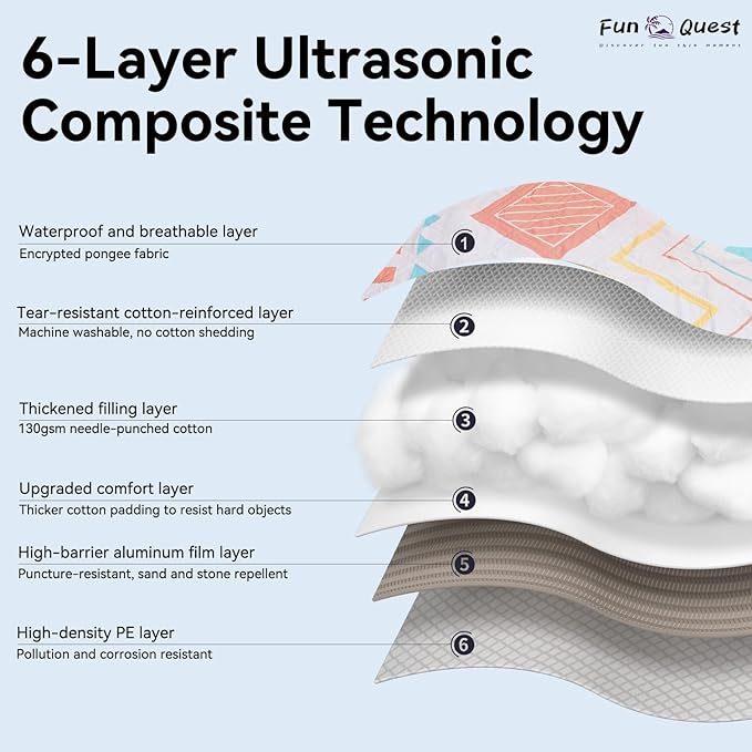 • 🌟[6-Layer Comfort & Durability] Unlike thin mats, this beach blanket has a premium 6-layer design: ultra-soft spring polyester, thick cotton padding, and a durable 3-layer PE aluminum backing. Cozy enough to sit or nap for hours — making it a great stadium blanket for outdoor events.