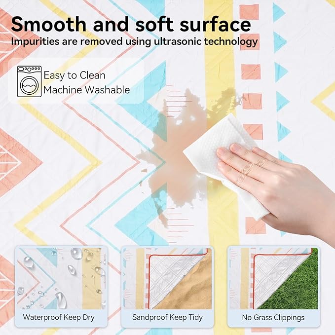 • 🧼[Easy Care, Machine Washable] Built for everyday use, this picnic blanket waterproof design resists spills and dirt. Simply shake it off or machine wash for a quick refresh. Strong stitching ensures long-lasting performance for countless gatherings.