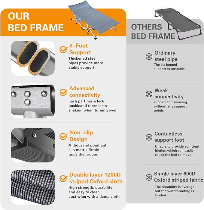 • [Sturdy Construction]: Strong, durable steel tube frame and heavy-duty steel legs. The cot reinforced oxford fabric, features a non-slip design for smooth support.