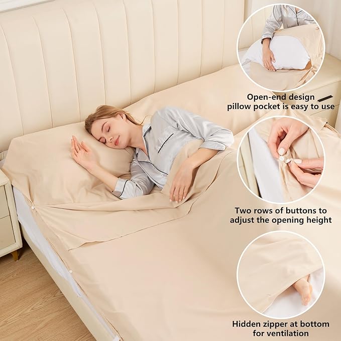 • Versatile design: The liner works as a summer camping sleeping bag with a pillow pocket that can stuff clothes to use as a pillow. It also serves as travel bedding, replacing the need to take sheet, pillowcase and blanket. Fits most hotel bed sizes