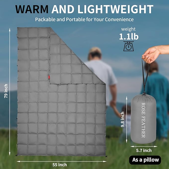 • 【Outdoor Down Camping Blanket】ROSE FEATHER down camping blanket can keep you warm and cozy no matter where you are. It can also be used as a sleeping bag alternative or supplement, or wearable blanket to accompany you on camping, backpacking, hiking, beach or festivals, or to rest on the sofa in the afternoo
