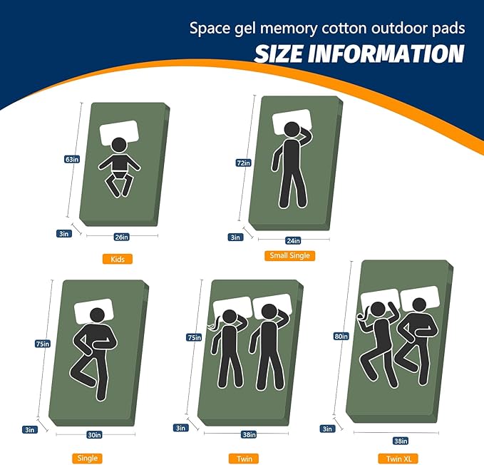 • 【MULTI-SIZE OPTIONAL & AFTER-SALES SERVICE WITHIN 24 HOURS】 5 sizes for you to choose from camping mattress full size, kids (63x26x3") small single (72x24x3”) single (75x30x3”) twin (75x38x3”) twin xl size (80x38x3”), Be sure to choose the most suitable size. Since we shipped by vacuum compression packaging, please Open the package and place it for about 24-48hours. If you have any question, feel free to contact us. Please believe that we will solve the problem for you within 24 hours.