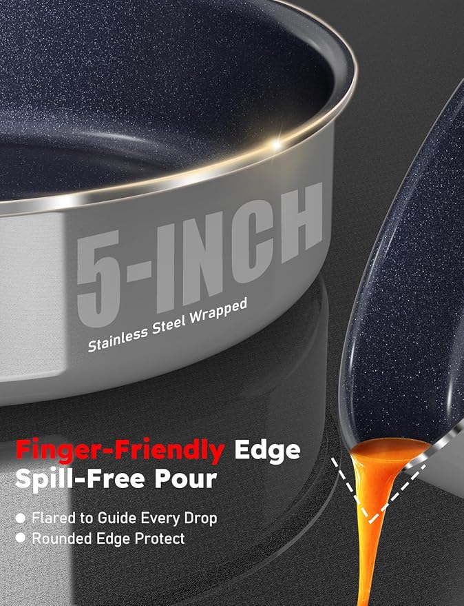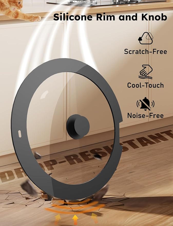 • DROP-RESISTANT GLASS LIDS: This non-stick cookware set includes two tempered glass lids with food-grade silicone rims for a secure, noise-free, and drop-resistant seal. The durable, shatter-resistant glass lets you monitor your cooking without lifting the lid. Cool-Touch silicone knobs stand upside down for added convenience, while four anti-slip bumps keep the lids securely in place to ensure safe, stable cooking every time