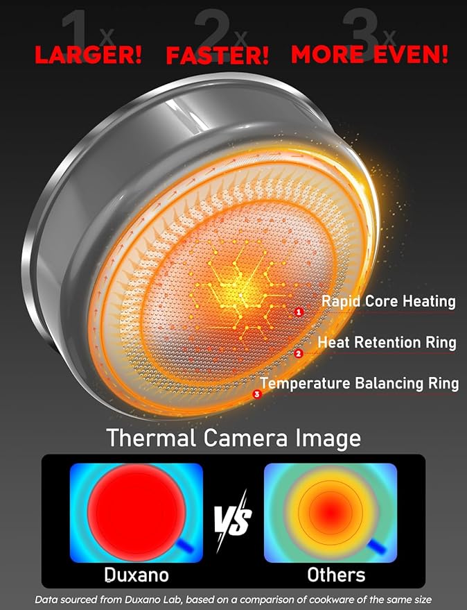 • 1X LARGER, 2X FASTER, 3X MORE EVEN: This Pots and pans features a larger heat-sensitive base with a 3-ring design for optimal heat distribution: Rapid Heating Core, Heat Retention Ring, and Temperature Balancing Ring. The advanced 3-ring system enhances heat uniformity by 3 times, effectively eliminating hot or cold spots for better cooking results. Additionally, the thick, anti-warp base allows ample time for preheating, so you can cook without rushing