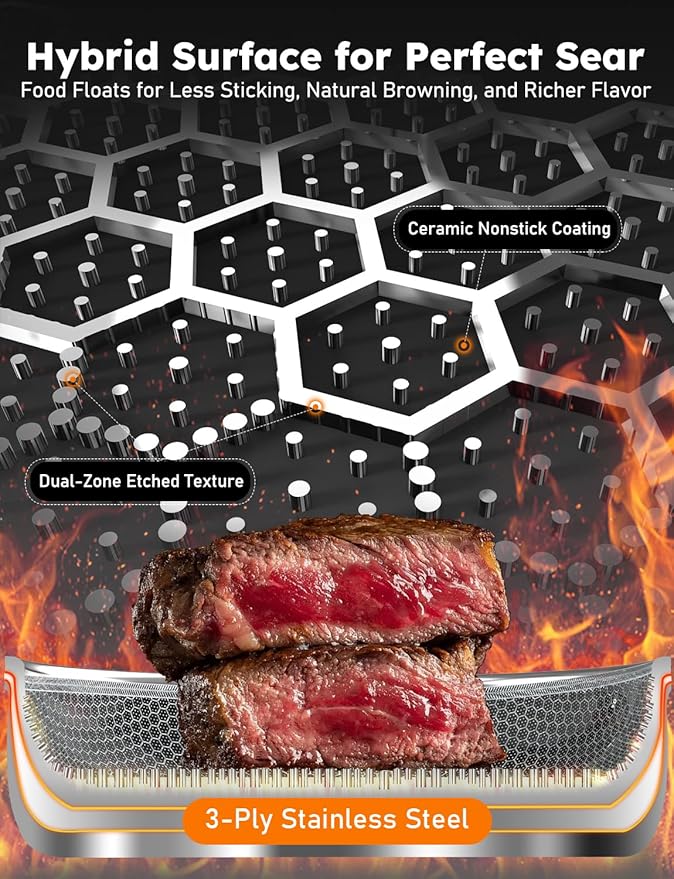 • 3-PLY STEEL FOR PERFECT SEARING: This premium Skillet features a 3-ply stainless steel core and 2-layer ceramic coatings, with a full-surface dual hexagon texture of variable heights that lifts food to reduce sticking and protect the bottom coating from wear. Compared to typical aluminum core fry pans, its 3-ply stainless steel core extends the lifespan up to 5X longer, making it perfect for frequent high-heat searing, grilling, frying, while delivering natural browning and richer flavor