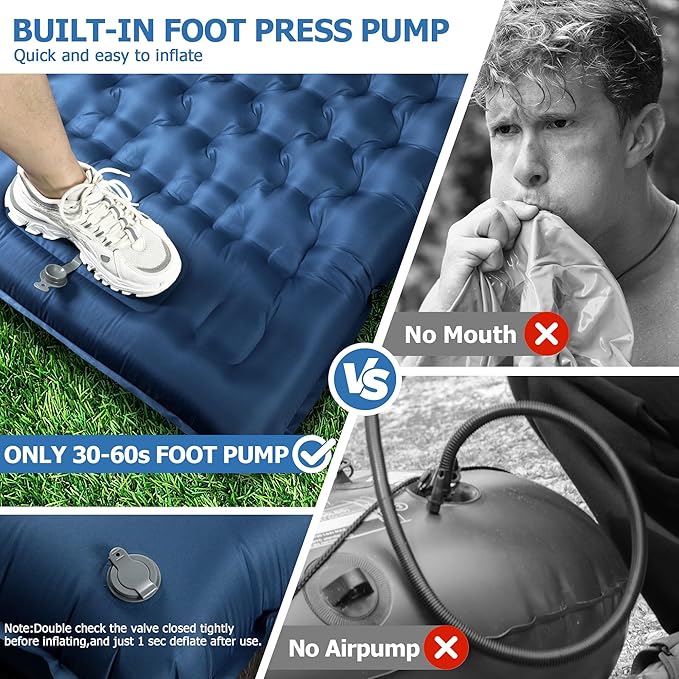 • 【80s Foot Press to Inflate - 1s Deflate】: Upgraded built-in foot pump sleeping mat - Just press the spot of the foot pump with your foot in 80s. NO MORE inflating by hand, mouth or carry a extra pump. Last but not the least, the deflation is easier, just open the air valve. You can add or release air to adjust the sleeping pad's firmness