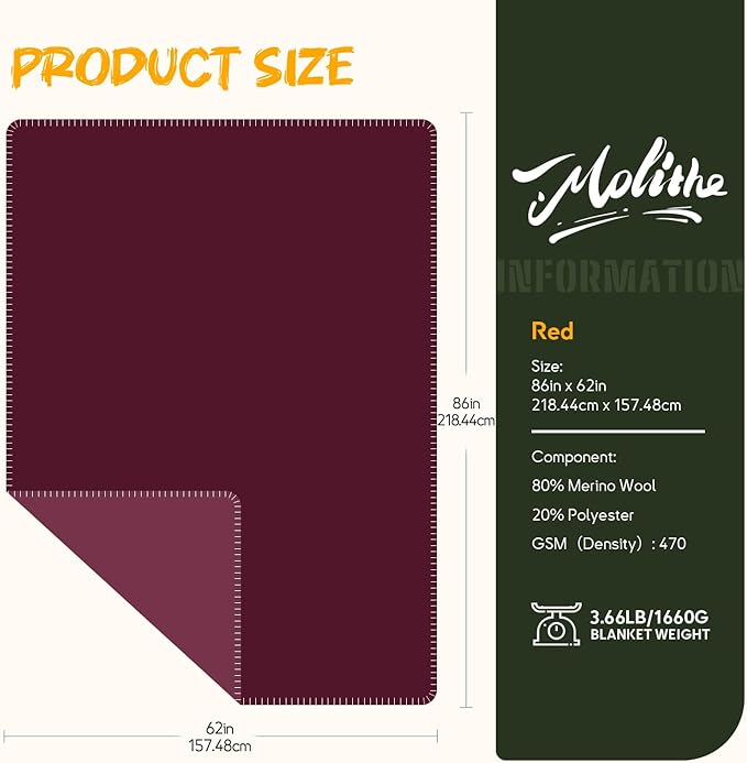 • Premium 80% Merino Wool Blend:Crafted with 80% high-quality Merino wool, this outdoor blanket excels in temperature regulation, rapid moisture-wicking, and superior warmth retention. The durable yet ultra-soft wool blend ensures long-lasting performance for rugged adventures.