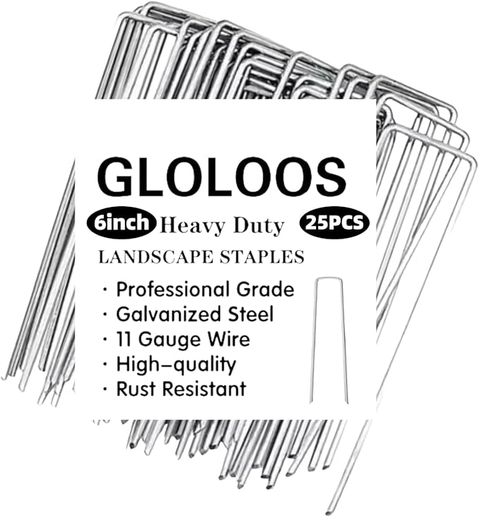 • Packaging:25 pack U-shaped lawn stakes with beveled ending are 11 gauge, 6 inches length, 1.5 inch adjustable width.The heavy duty garden stakes for gardening and landscaping projects.