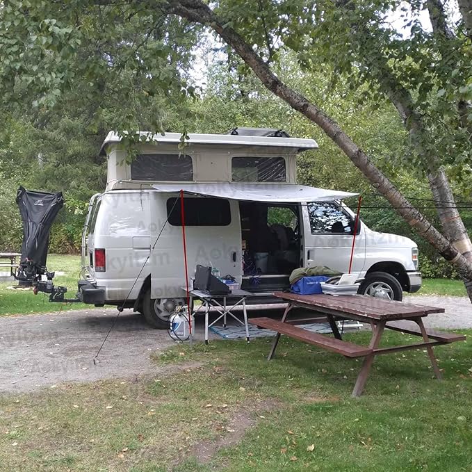 • 【More Humanized Design】:The steel stakes at the top of the van awning support poles can be inserted into the tarp holes to achieve a tighter connection between the tarp and the tent poles. The feet have a non-slip design to keep them firmly in place, whether they are on the green stone or grass.