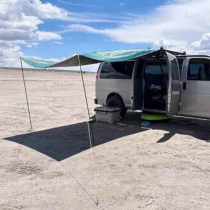 • 【More Humanized Design】:The steel stakes at the top of the van awning support poles can be inserted into the tarp holes to achieve a tighter connection between the tarp and the tent poles. The feet have a non-slip design to keep them firmly in place, whether they are on the green stone or grass.