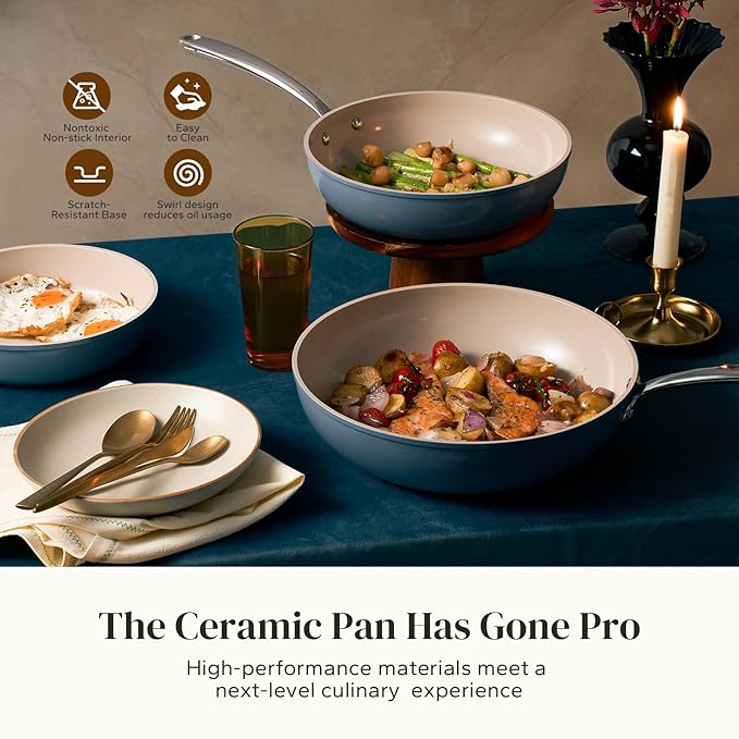• EXCELLENT COMPATIBILITY: The induction cooking set features a large magnetized base that provides a larger heating area for fast and even heat distribution without hot spots. Suitable for all stovetops. Nonstick pan set and handle is oven safe up to 842 °F