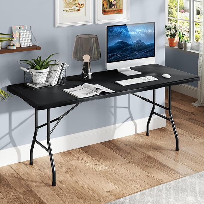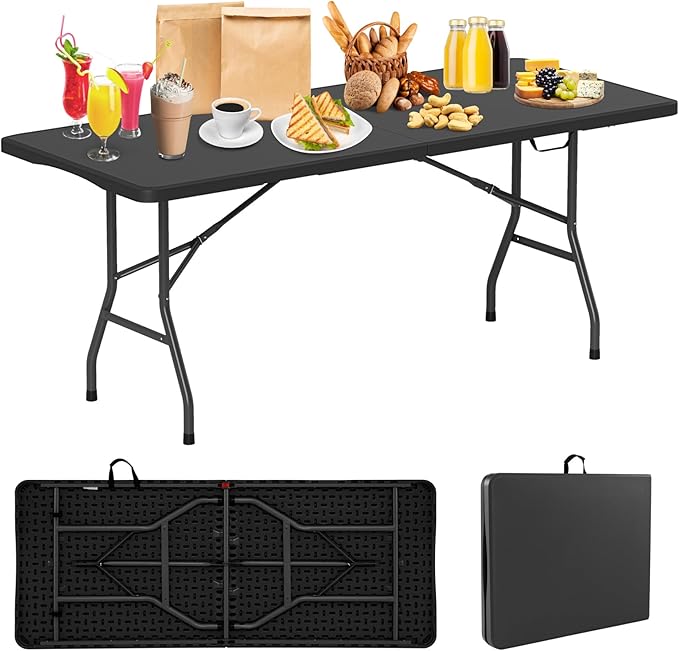 Folding Table, HDPE Portable Table with 6 ft Long Tabletop, Metal Frame Picnic Camping Table with Safe Lock, Collapsible Dining Table for Camping, Picnic, Party (Black, 6 FT)