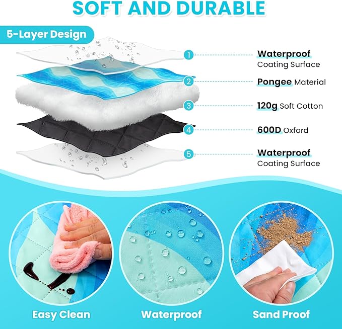 • SAND PROOF AND WATER RESISTANT-Made of 5 layers, it can prevent water effectively that always keep the mat dry. It is sand-proof that you can get rid of the sand easily by grabbing a corner of the blanket. Perfectly suitable for siting or lying on grass, beach, floor or any kindly of surface, giving you soft and comfortable feelings