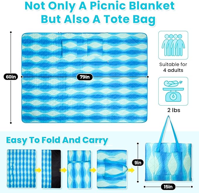 • OVERSIZED FOR 4 ADULTS: Our Picnic blankets unfolded size is 79''x 60'', it’s large enough to fit for 4 adults , giving your family and pets a large area to play ,The weight of the mat is only 2.3lbs, you can fold it with simple steps, carry or store it anywhere you want