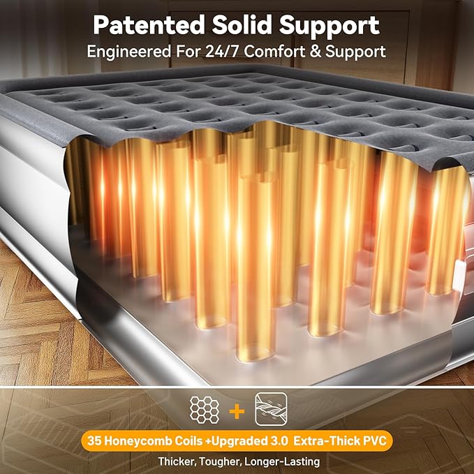 • 【2025 Upgraded Patented Coils & Structure Design–Covered By U.S. Patent NO. US012108880B2】,The queen air mattress features internal coils in a honeycomb pattern, reinforced by composite mesh and fiber layers.This advanced structure distributes weight evenly across the 18" height, prevents sagging, and supports up to 660 lbs without bottoming out