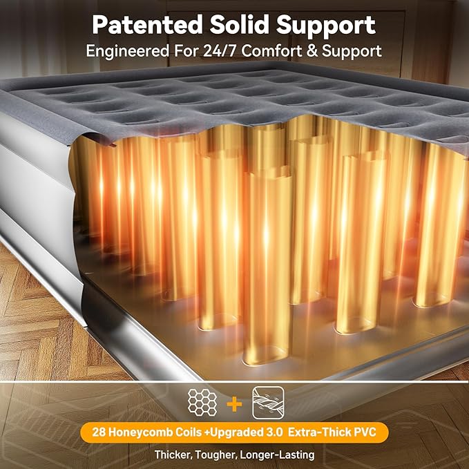 • 【2025 Upgraded Patented Coils & Structure Design–Covered By U.S. Patent NO. US012108880B2】The full air mattress features 28 internal coils in a honeycomb pattern, reinforced by composite mesh and fiber layers.This advanced structure distributes weight evenly across the 18" height, prevents sagging, and supports up to 660 lbs without bottoming out
