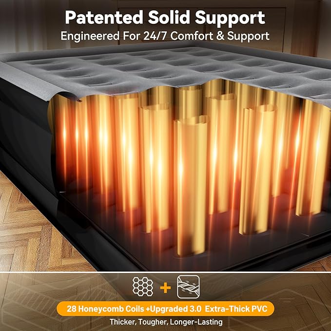 • 【2025 Upgraded Patented Coils & Structure Design–Covered By U.S. Patent NO. US012108880B2】The full size air mattress with built in pump features 28 internal coils in a honeycomb pattern, reinforced by composite mesh and fiber layers.This advanced structure distributes weight evenly across the 18" height, prevents sagging, and supports up to 660lbs without bottoming out