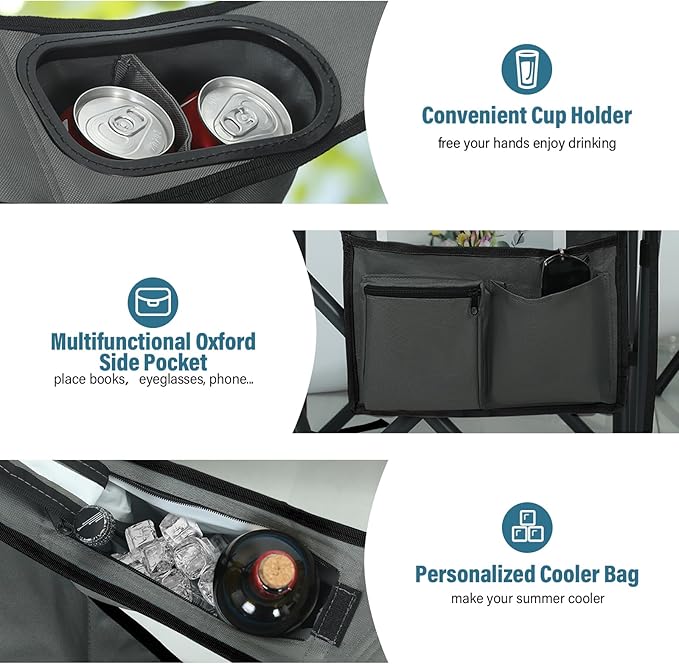 • Multifunctional Storage Design: This folding chair features a dedicated wine glass holder and fixed dual cup holders to securely fit various-sized drinks, along with a built-in insulated cooler pouch for up to 6 cans. The reinforced Oxford fabric side pocket organizes essentials like phones or tools, while the oversized mesh back panel offers spacious storage for bulkier items such as clothing, towels, or outdoor gear. Engineered with abrasion-resistant seams and rust-proof hardware, all compartments maintain item security during camping, picnics, or sports events, ensuring hands-free convenience without compromising durability.