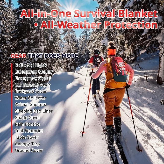 • VERSATILE SURVIVAL SUPPLIES: Serves as a shelter, shield,poncho,shade, ground cover, or emergency signal, enhanced by its oversized, tear-resistant build. Perfect for marathons, wilderness survival, camping, running, hiking, earthquake disaster scenarios or first aid, this reusable emergency blanket ensures long-term reliability, adapting to diverse needs for safety in unpredictable situations