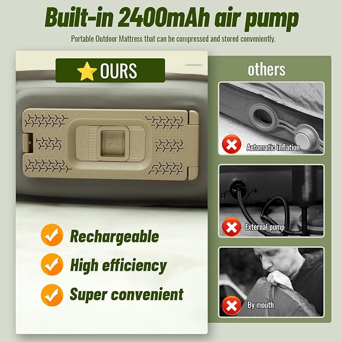 • One-Button Inflation & Deflation: The Camping Pad with upgraded built-in automatic pump enables effortless setup, hands-free inflation, and deflate completely for compact storage. Easily adjust firmness and thickness to your preference.