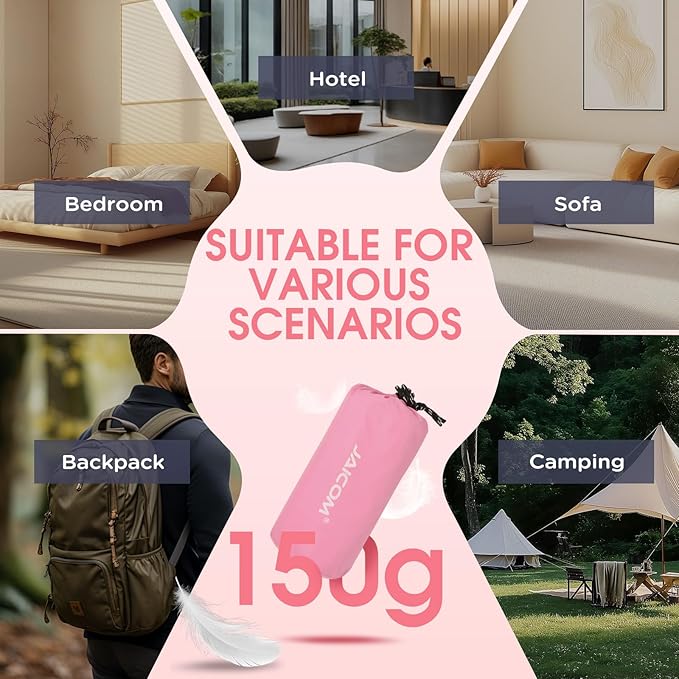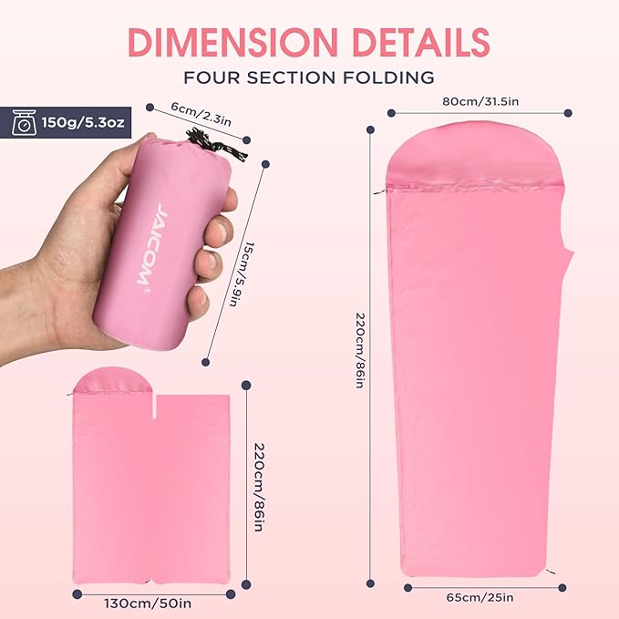 • WIDE RANGE OF USES - The JAICOM Sleeping Bag Liner is the perfect companion for backpacking. Ultra-light and small in size, it won't take up much space in your backpack and won't add weight. You can use it in hotels to isolate yourself from the outside world if you don't want to touch the sheets, in outdoor camping it not only protects your sleeping bag, but also fits over your sleeping pad, and it doubles as a sofa cover in your living room, making cleaning a breeze