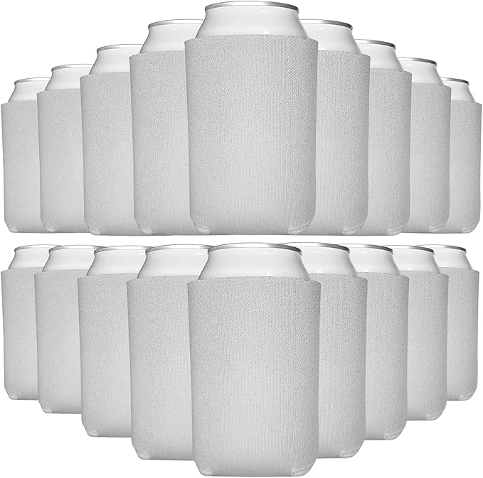 • Includes Twenty-Five (25) collapsible foam can cooler blanks. No brand logos or tags. Make your own design with heat transfer vinyl, infusible ink, sublimation, screen printing, direct to film transfer, and fabric markers. Fabric details - scuba knit polyester fabric on premium 4mm thick poly foam insulator. The collapsible design makes them perfect for a heat press or crafting iron. See the video for heat transfer, time, and pressure settings.