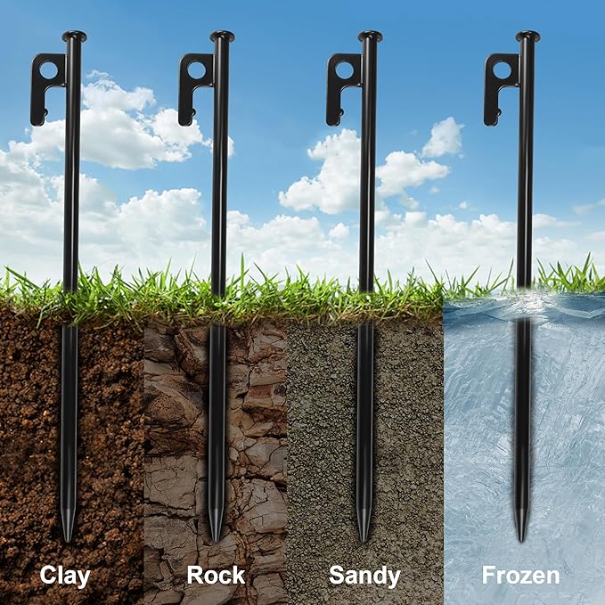 • HEAVY DUTY CAMPING GROUND STAKES: Made of high-quality forged S45C steel, completely get rid of the snapping and bending, more durable and corrosion-resistant. Available in rocky place hard soil desert snowfield and grassland