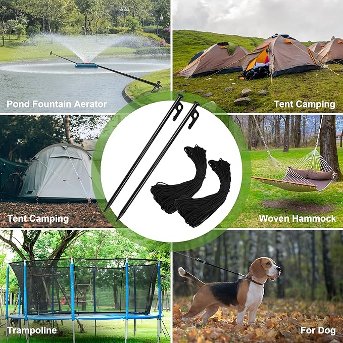 • MULTIFARIOUS USE: A must-have ground anchors & multifunction paracord for outdoor activities. Essential tool for securely anchoring camping tents, pond fountain aerator, canopies, shelters, campers, fence posts, trampolines, trees, landscape trim, or outdoor decoration, etc. It can add to your bug out gear, camping accessories, hiking, or survival tools for your next outdoor adventure